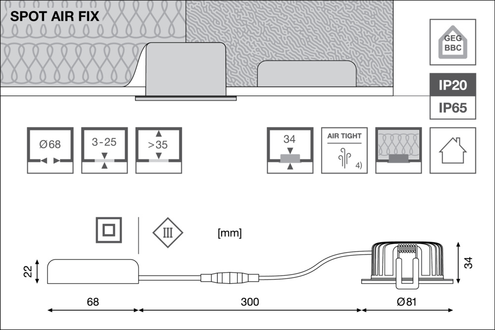 | Afdekking armatuur met thermisch isolatiemateriaal mogelijk |